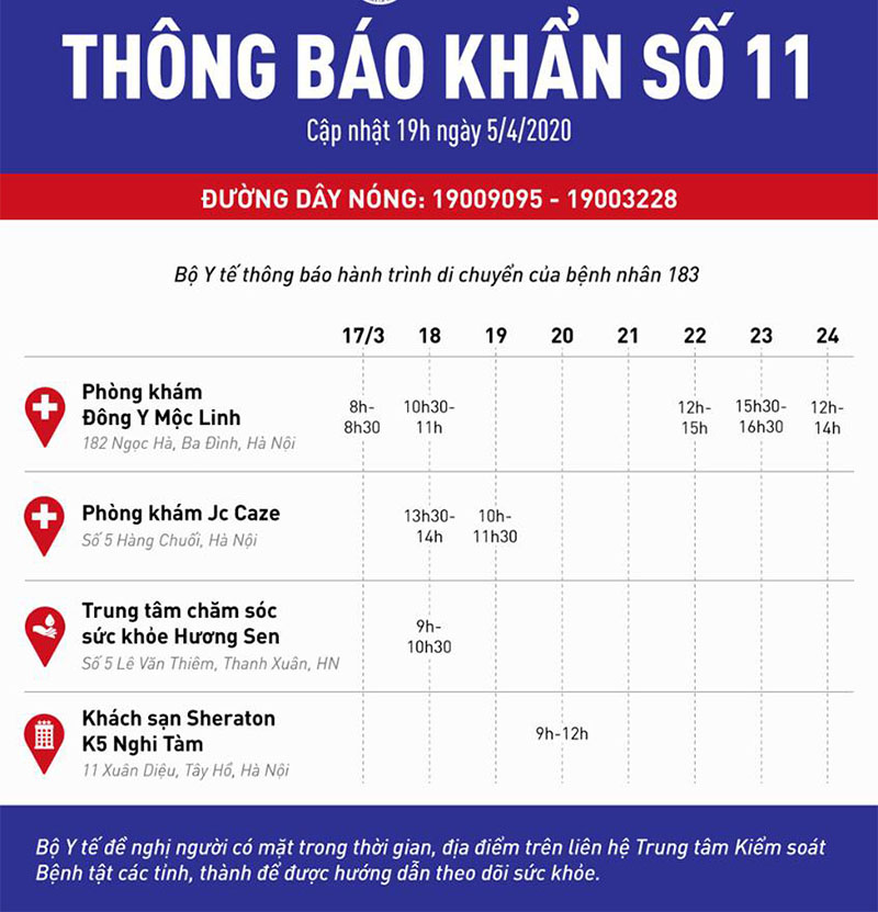 Hành trình di chuyển của bệnh nhân 183 như sau:
