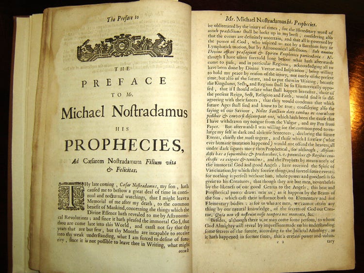 Một ví dụ như vậy là cuốn sách được viết bởi Michel de Nostredame, được biết đến nhiều hơn với tên gọi là Nostradamus và được xuất bản năm 1555 với tên gọi Les Propheties. Cuốn sách được xuất bản bởi Mace Bonhomme là tác phẩm nổi tiếng nhất của Nostradamus, và là một tập hợp các bài thơ được viết bằng mật mã, quatrain, hợp nhất trong mười tập thơ được gọi là Century của một trăm quatrain. Công việc của Nostradamus dường như không tuân theo sự gắn kết theo thời gian cụ thể. Ông đã viết cuốn sách bằng cách sử dụng kết hợp tiếng Pháp, tiếng Hy Lạp, tiếng Latin và tiếng Occitan và chứa đảo chữ và thần thoại.