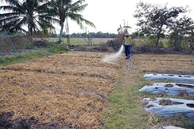 Mỗi tháng chị Mai phải bỏ ra 12 triệu đồng mua nước ngọt tưới cho cây sầu riêng nhằm ngăn chặn tình trạng thiếu nước khiến cây bị rụng trái.