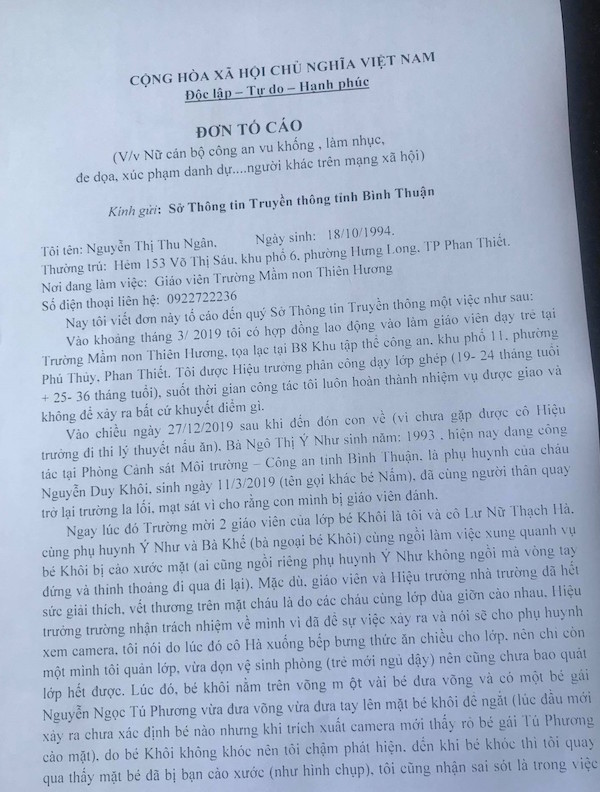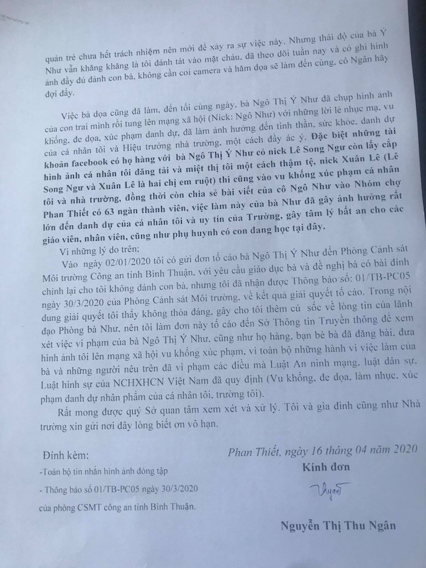 Ngày 16/4, cô giáo Nguyễn Thị Thu Ngân giáo viên tại Trường Mầm non Thiên Hương, phường Phú Thủy, thành phố Phan Thiết, tỉnh Bình Thuận đã gửi đơn tố cáo lên Sở Thông tin Truyền thông tỉnh Bình Thuận, về việc nữ cán bộ công an, vu khống, làm nhục, đe dọa, xúc phạm danh dự trên mạng xã hội.