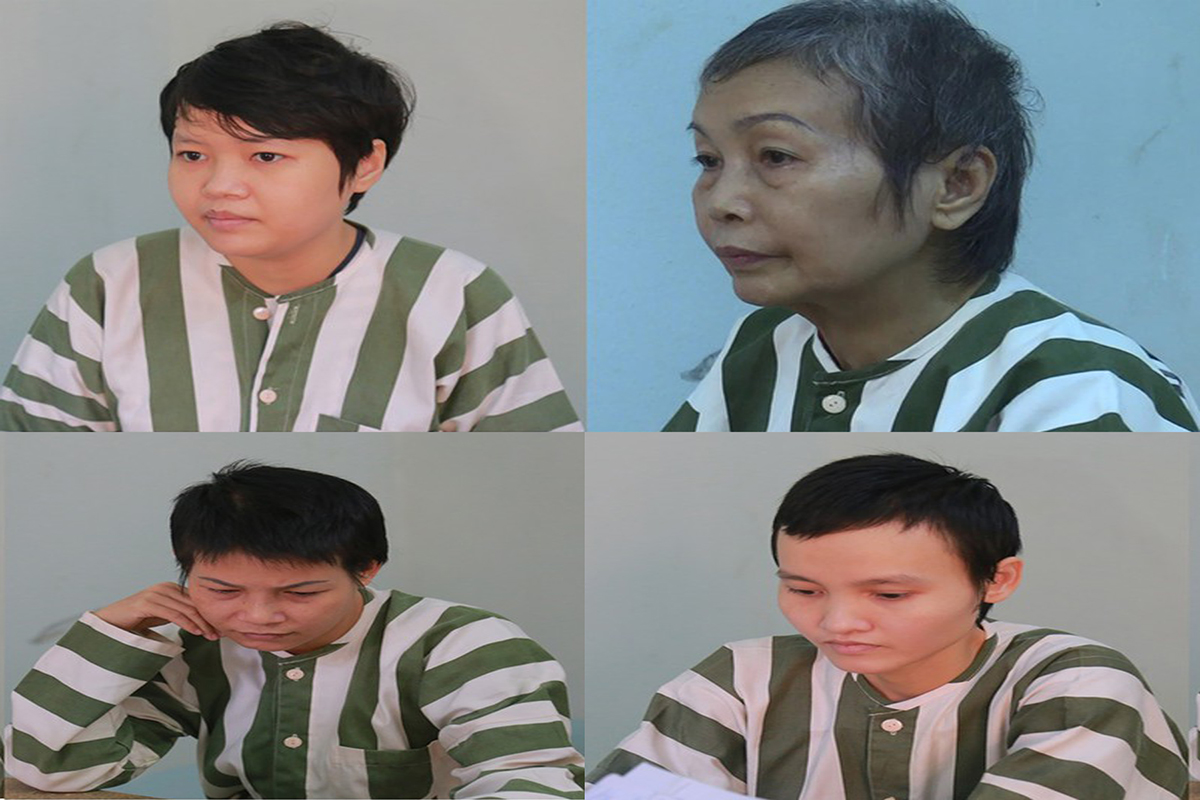 Từ trái qua, các bị can Phạm Thị Thiên Hà, Trịnh Thị Hồng Hoa, Nguyễn Ngọc Tâm Huyên và Lê Ngọc Phương Thảo.