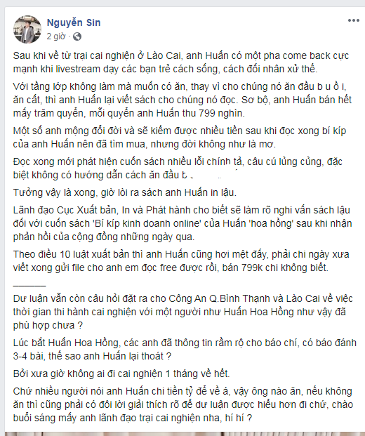 Chung niềm bức xúc với dư luận, mới đây Hot facebooker Nguyễn Sin đã đăng đàn “bóc phốt” Huấn Hoa Hồng trên trang cá nhân. Ngoài đặt nghi vấn “Bí kíp làm giàu” của Huấn Hoa Hồng là sách lậu, Nguyễn Sin còn đề cập đến việc thời gian thi hành cai nghiện của “giang hồ mạng” kết thúc sớm hơn với dự kiến ban đầu.