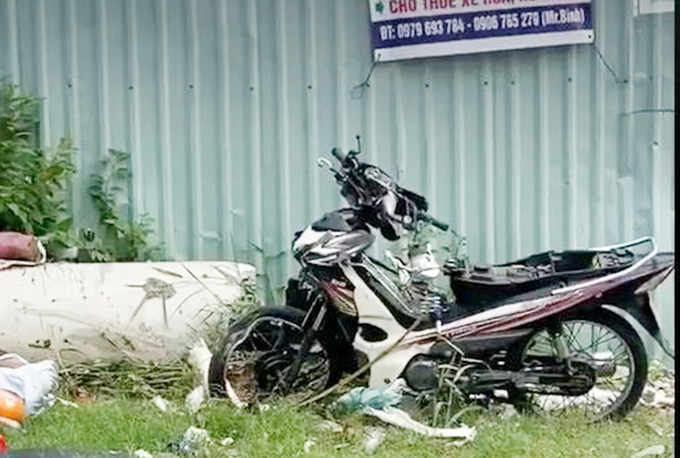 Xe máy của nạn nhân hư hỏng nặng sau khi tông vào ống cống ven đường. Ảnh: Quốc Thắng.