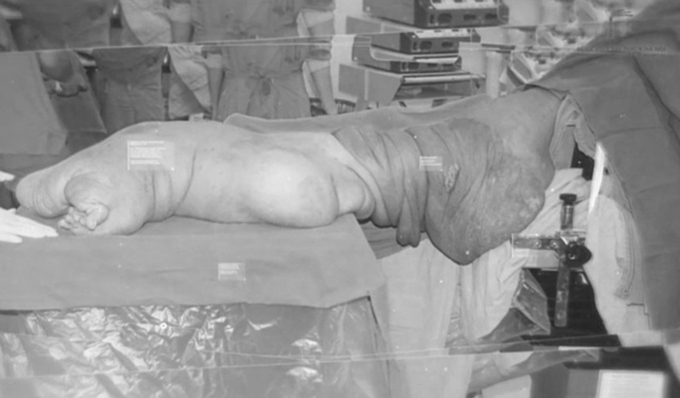 Các bác sĩ nhận định bệnh nhân bị thiếu máu trầm trọng, gù vẹo cột sống, chân trái, thắt lưng trái phì đại khổng lồ ước chừng 40 kg trong khi trọng lượng toàn bộ cơ thể 76 kg.