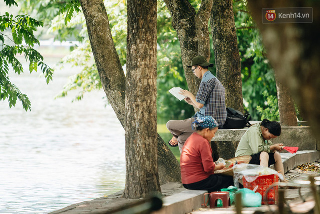 Ven hồ Gươm, một số người lựa chọn dừng chân tại những chiếc ghế dưới bóng cây mát mẻ để nghỉ trưa