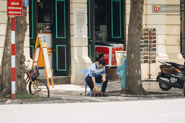 Những người lao động, xe ôm cũng tranh thủ ngồi nghỉ dưới bóng cây, không quên mang theo chiếc quạt giấy, cốc trà đá giải nhiệt... thậm chí là khi ngồi nghỉ vẫn khăn áo kín mít để tránh cái nắng nóng từ mặt đường phả lên.