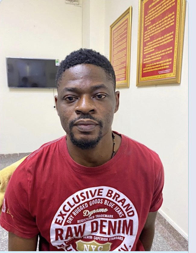 Đối tượng Chukwugekwe Godwin Ajearo (áo đỏ) tại cơ quan công an.