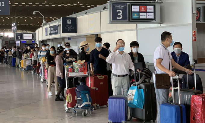 Công dân Việt Nam xếp hàng tại sân bay ở Pháp, chuẩn bị lên máy bay về nước hôm 28/6. Ảnh: Bộ Ngoại giao.