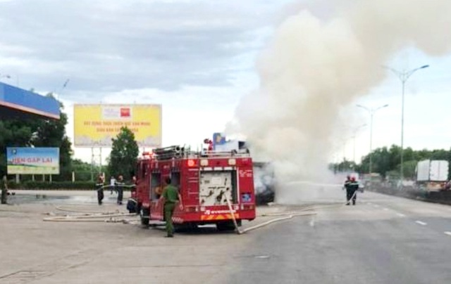 Tài xế Lục đã cùng nhân viên cây xăng tức tốc lấy bình cứu hỏa dập lửa nhưng không thành. Chỉ vài phút, đám cháy bao trùm cả chiếc xe, khói bốc lên lớn. Nhiều người đi trên quốc lộ 1 phải dừng xe tránh từ xa vì sợ xe kéo phát nổ và cháy lan sang cây xăng.