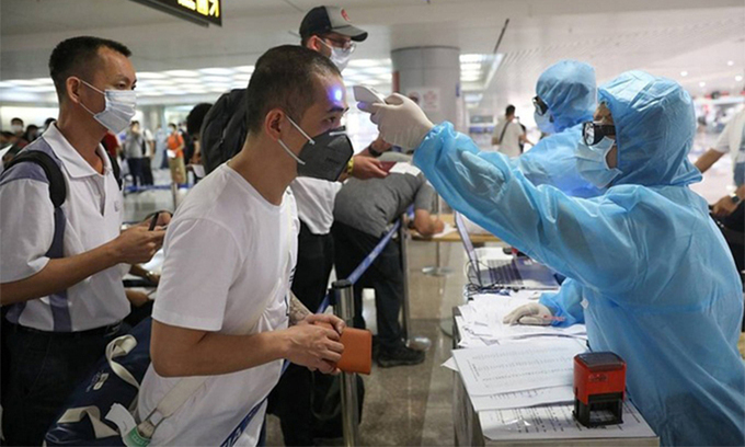 Hành khách kiểm tra thân nhiệt khi nhập cảnh sân bay Tân Sơn Nhất ngày 17/3. Ảnh: Hữu Khoa.