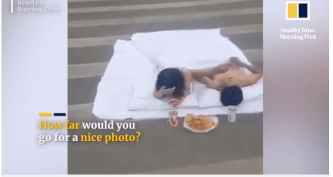 Đoạn video đang “gây bão” trên mạng xã hội Trung Quốc thu hút hàng chục nghìn lượt xem, ghi cảnh một đôi nam nữ ăn mặc hớ hênh thiếu vải, quấn mình trong chăn và nằm giữa phố đông người để chụp ảnh cưới. Sự việc ảnh hưởng tới giao thông đi lại, đồng thời khiến nhiều người thấy phản cảm và khó chịu.