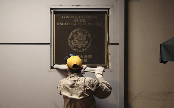 Biển hiệu của Tổng lãnh sự quán Mỹ tại Thành Đô, Trung Quốc bị tháo bỏ - Ảnh: SOUTH CHINA MORNING POST