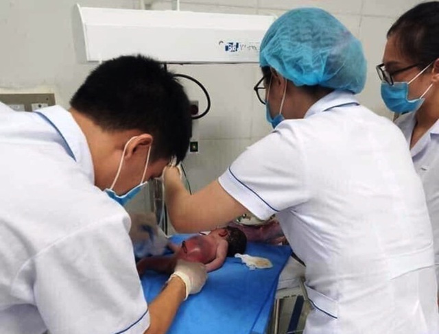 Cháu bé ngay sau khi được sơ cứu tại Trạm y tế xã Đông Vinh đã được đưa lên Bệnh viện Nhi tỉnh Thái Bình để cấp cứu. Tại đây, các bác sĩ chẩn đoán cháu bé bị suy hô hấp, nhiễm trùng sơ sinh, đẻ non, gãy xương đòn phải, rối loạn đông máu, rối loạn toan kiềm và bỏng độ 1, 1/2 người trái.