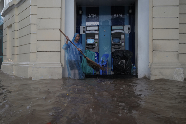 Người dân buôn bán trên vỉa hè vội thu dọn, đóng gói, bọc nylon đồ đạc để đưa lên vị trí cao hơn.