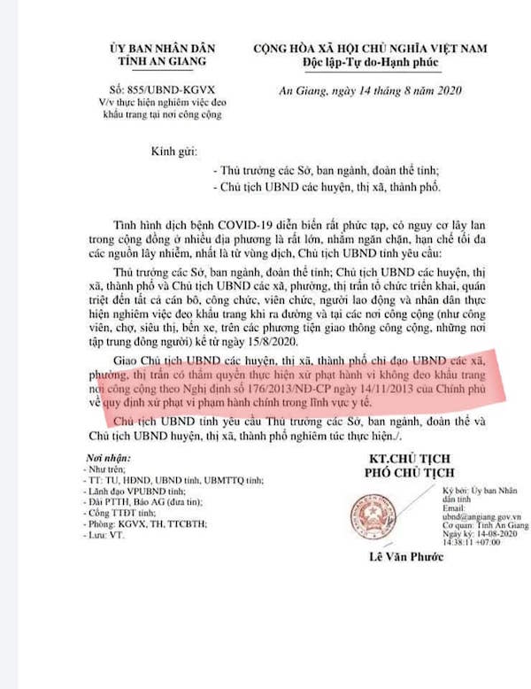 Hai ngày nay, người dân Long Xuyên xôn xao việc toàn bộ cán bộ của thành phố Long Xuyên... chống lệnh lãnh đạo tỉnh. Theo đó, ngày 14/8 Chủ tịch tỉnh An Giang ra chỉ đạo phải đeo khẩu trang toàn tỉnh khi ra đường, tại nơi công cộng. Ai vi phạm sẽ bị xử lý theo quy định của pháp luật. Chỉ đạo này rất đúng đắn và được nhân dân đồng thuận, vì tình hình dịch bệnh diễn biến phức tạp.
