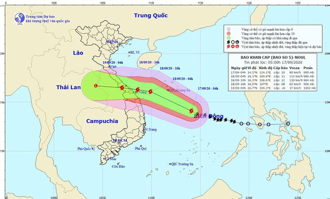 Do ảnh hưởng của bão số 5 nên từ chiều nay (17/9) đến đêm 18/9 các tỉnh từ Hà Tĩnh đến Quảng Ngãi có mưa to đến rất to với lượng mưa phổ biến 200-300mm/đợt, có nơi trên 400mm. Các tỉnh Nam Trung Bộ, Bắc Tây Nguyên có mưa vừa, mưa to với lượng mưa phổ biến 50-100mm/đợt.