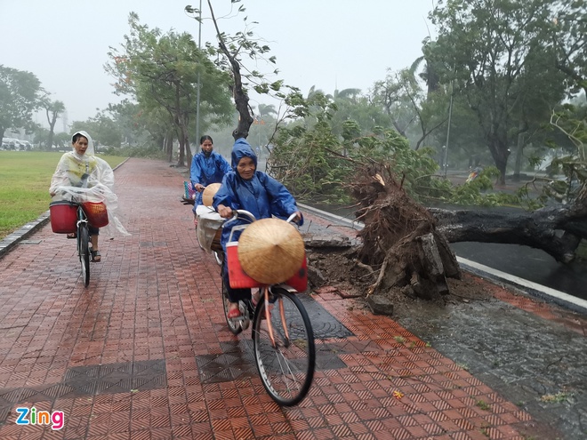 Tại TP Huế, từ 8h, mưa lớn và gió giật mạnh quật đổ nhiều cây cối. Người dân khá khó khăn khi tham gia giao thông trên đường bằng xe máy và xe đạp.