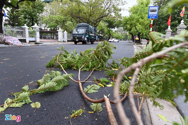 Tại Huế lúc 7h sáng 18/9, trời không mưa nhưng gió khá mạnh. Một số cành cây lớn bị gió quật gãy đổ trên đường.