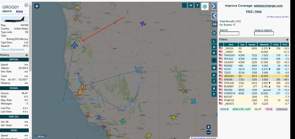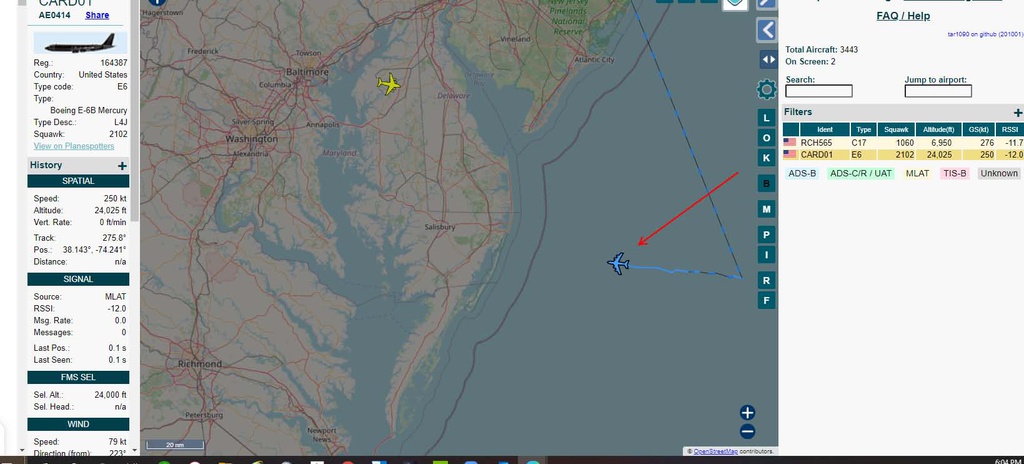 Máy bay E-6 Mercury xuất hiện trên hệ thống giám sát không lưu đa điểm MLAT nửa đêm 2/10. Ảnh: Tim Hogan.