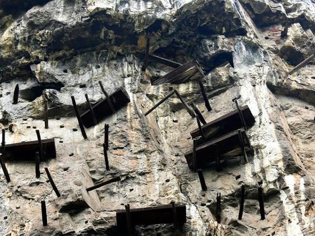 Thay vì chôn xuống đất, từ hàng ngàn năm nay, những cỗ quan tài nơi đây vẫn nằm lơ lửng trên các vách núi. Người bản địa tin rằng, với cách mai táng này, người đã khuất sẽ sớm được lên thiên đàng.