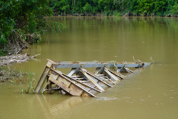 Một phần cầu sắt nhô lên mặt nước sau ba ngày bị lũ cuốn, chiều 30/10. Ảnh: Trần Hoá.