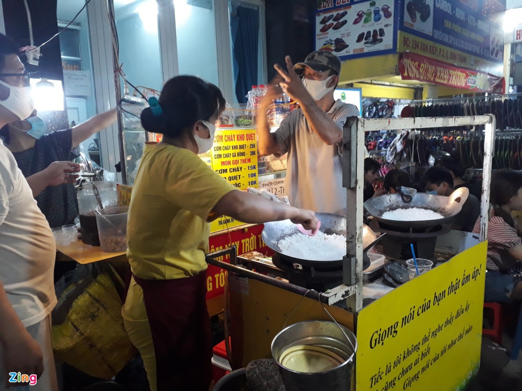 Đến khi anh Sơn học được nghề làm bánh tráng, đồ ăn vặt, hai người dựa vào chiếc xe đẩy, bán hàng mưu sinh. Mới đây, anh bán thêm món cơm cháy kho quẹt, khách đến ngày càng đông.