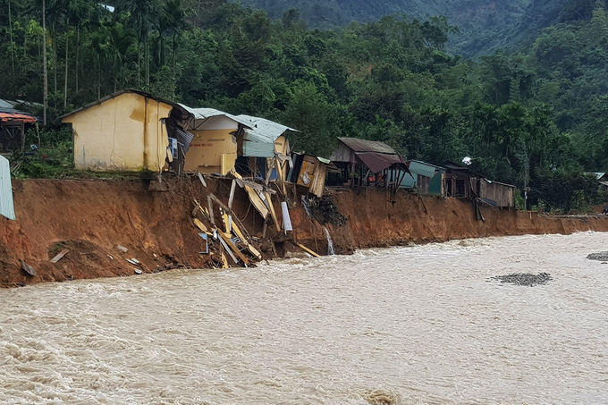 Những ngôi nhà của người dân thôn 2, xã Trà Leng, nằm chênh vênh bên bờ đất sạt lở. Ảnh: Phi Yến.