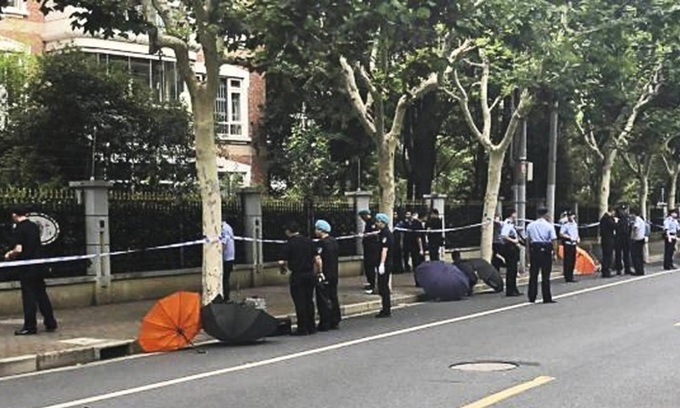 Cảnh sát phong tỏa hiện trường vụ đâm dao trước cổng trường tiểu học ở Thượng Hải ngày 28/6/2018. Ảnh: Paper.