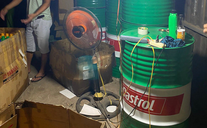 Sau khi có nhớt nguyên liệu, Kiến thuê Ngô Văn Đằng, Nguyễn Văn Đức dùng bơm để bơm nhớt từ phi lên bồn chứa rồi chiết sang các xô, can, chai và dán nhãn hiệu, đóng seal thành nhớt giả thành phẩm.