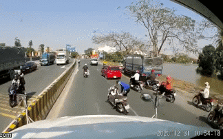 Thấy vậy, một nam thanh chạy xe máy đã tiến tới dừng xe, rồi kéo người đàn ông vào lề đường. Khi anh nay rời đi, ông ta định tiếp tục lao ra ngoài nhưng bất thành. Toàn quá trình trình diễn ra sự việc đã được camera hành trình của container ghi lại.