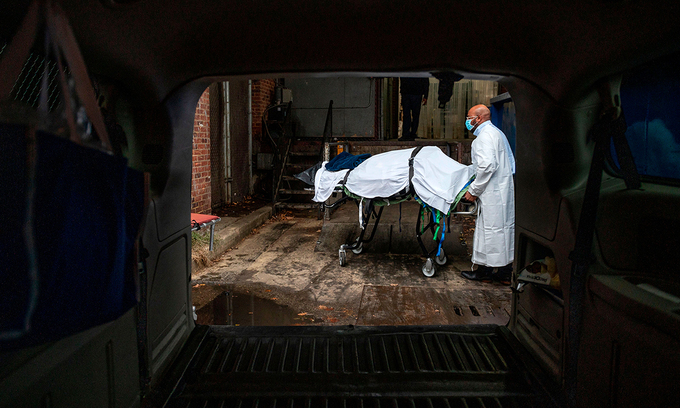 Nhân viên dịch vụ hỏa táng vận chuyển xác người chết vì Covid-19 tại một bệnh viện ở Baltimore, bang Maryland, hôm 24/12. Ảnh: AFP.