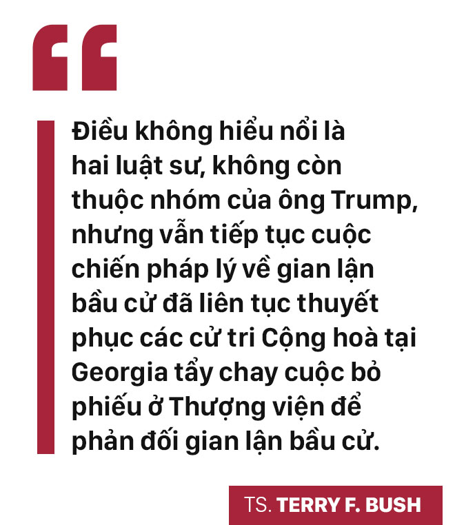 Điều không hiểu nổi là hai luật sư, không còn thuộc nhóm của ông Trump, nhưng vẫn tiếp tục cuộc chiến pháp lý về gian lận bầu cử đã liên tục thuyết phục các cử tri Cộng hoà tại Georgia tẩy chay cuộc bỏ phiếu ở Thượng viện để phản đối gian lận bầu cử. Một luật sư khác thì cho dựng các tấm biển quảng cáo lớn ngoài trời khắp tiểu bang với lời kêu gọi những người Cộng hoà không đi bỏ phiếu.