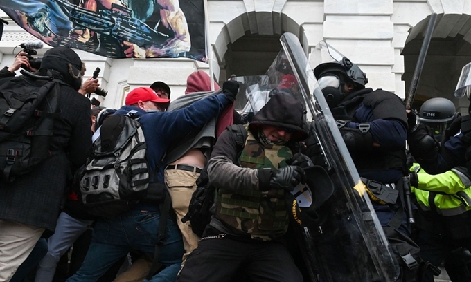 Người ủng hộ Tổng thống Trump đụng độ với cảnh sát bên ngoài tòa nhà quốc hội Mỹ hôm 6/1. Ảnh: AFP.
