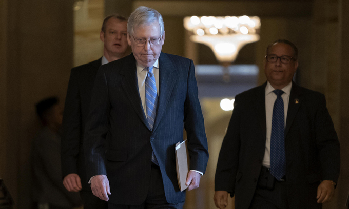 Lãnh đạo phe Đa số Thượng viện Mitch McConnell sau phiên họp ở Đồi Capitol hồi tháng 3/2020. Ảnh: AP.
