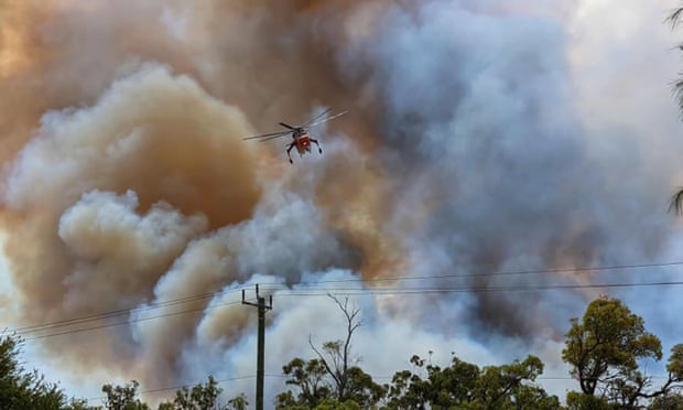Máy bay trực thăng ném bom nước chữa cháy rừng ở Kwinana, phía Nam thành phố Perth. (Ảnh: The Guardian)