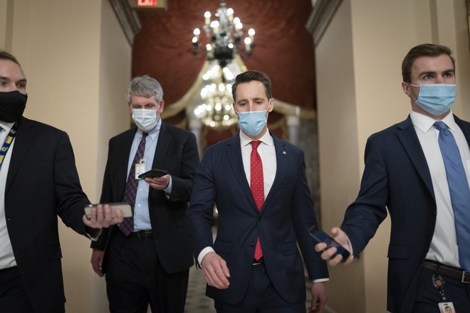 Thượng nghị sĩ Josh Hawley, đảng viên Cộng hòa, tiến vào trụ sở quốc hội để phản đối kết quả bầu cử sau khi người ủng hộ ông Trump chiếm đóng Điện Capitol trong nhiều giờ liền. Ảnh: AP.