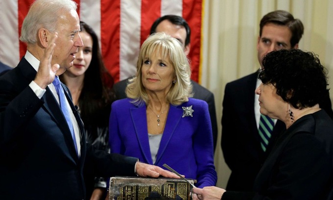 Joe Biden tuyên thệ nhậm chức phó tổng thống trước thẩm phán Tòa án Tối cao Sonia Sotomayor (phải) tại Đài quan sát Hải quân Mỹ tại thủ đô Washington hồi tháng 1/2013. Ảnh: AFP.