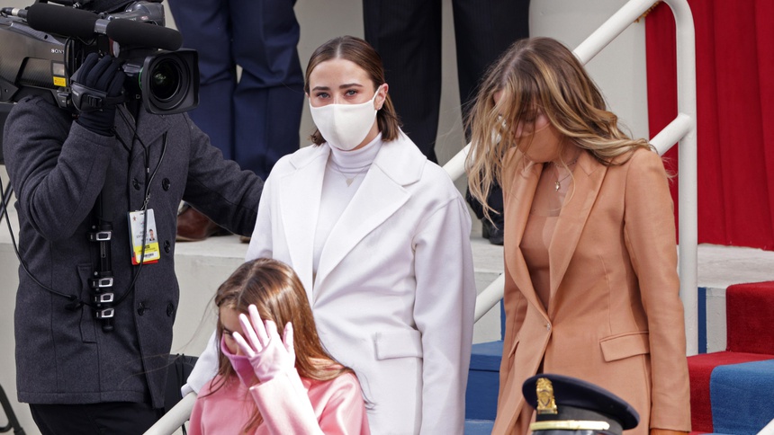 Naomi (28 tuổi), cháu gái đầu lòng của tổng thống Mỹ, chọn một bộ váy thanh lịch màu trắng, biểu tượng của phong trào chính trị Suffragette. Em gái của cô, Finnegan (21 tuổi), mặc chiếc áo khoác dạ dài màu camel thanh lịch. Ảnh: CNBC.