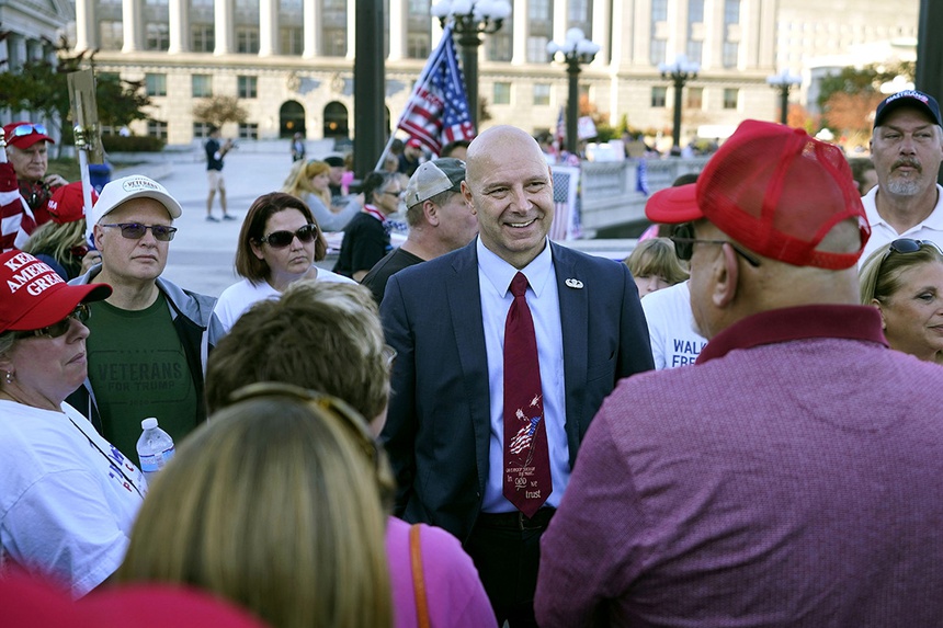 Thượng nghị sĩ bang Pennsylvania, ông Doug Mastriano, trò chuyện với đám đông biểu tình bên ngoài tòa nhà quốc hội. Ảnh: AP.