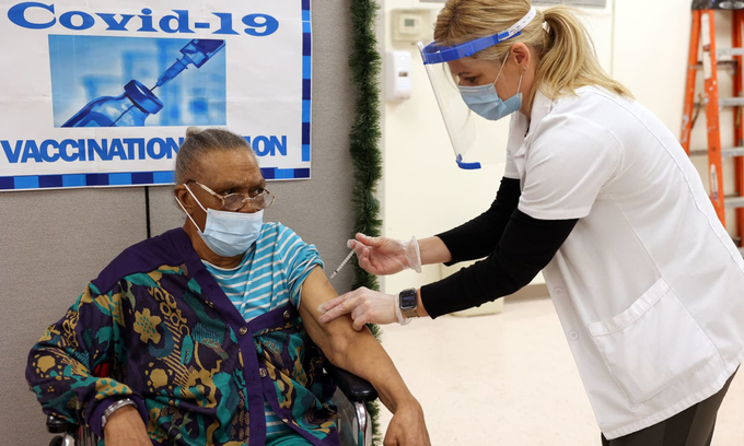Nhân viên y tế tiêm vaccine Covid-19 cho một người cao tuổi ở Brooklyn, New York hồi cuối tháng 12/2020. Ảnh: Reuters.