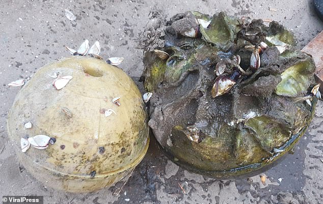 Ngư dân Niyomdecha tìm thấy viên ngọc melo màu cam trong vỏ ốc dính trên phao (ảnh: Daily Mail)
