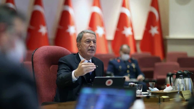 Bộ trưởng Quốc phòng Thổ Nhĩ Kỳ Hulusi Akar tại cuộc họp báo ở Ankara hôm 13/01/2021. (Ảnh. Getty Images)