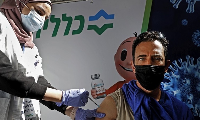Nhân viên y tế tiêm vaccine Covd-19 của Pfizer/BioNtech cho người dân tại thành phố Petah Tikva, Israel hôm 1/2. Ảnh:AFP.