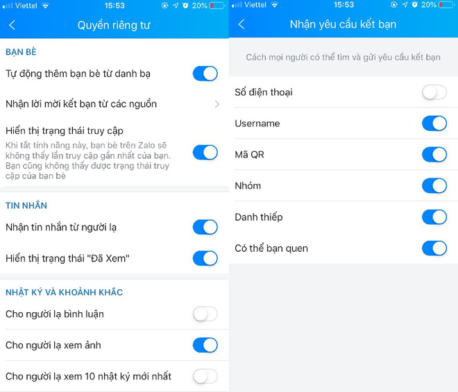 Bước 3: Tiếp theo bạn nhấn vào Nhận lời mời kết bạn từ các nguồn và tắt mục Số điện thoại đi.