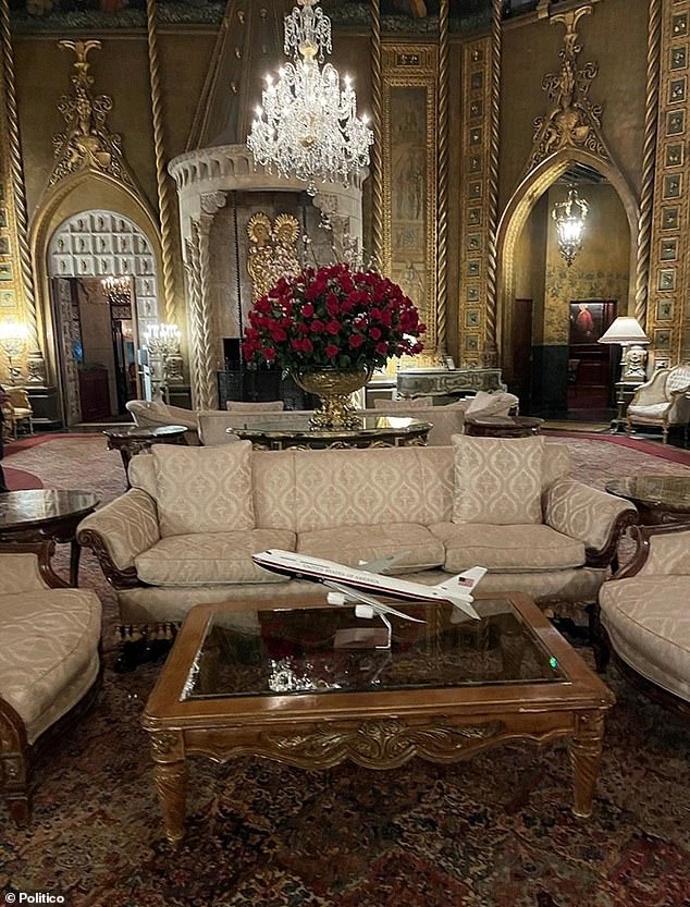 Mô hình đề xuất sửa đổi màu của máy bay Không quân Một hiện đang được trưng bày trên bàn cà phê ở sảnh Mar-A-Lago. Ảnh: Politico