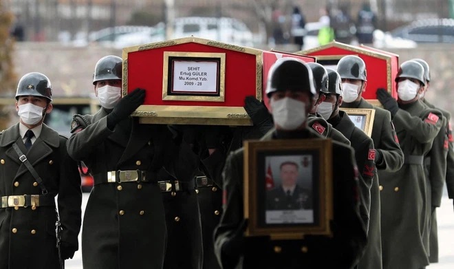 Tang lễ các quân nhân Thổ Nhĩ Kỳ thiệt mạng trong chiến dịch tại bắc Iraq, ngày 12/2/2021 (Ảnh: AFP)