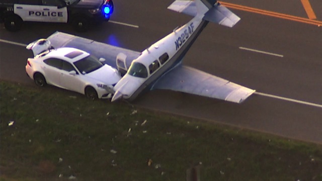 Một máy bay Mỹ gặp trục trặc buộc phải hạ cánh khẩn cấp xuống đường cao tốc và đâm cắt mặt một ô tô đang lưu thông trên đường.