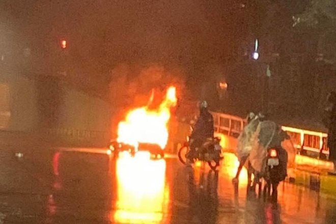 Sau vụ va chạm, chiếc xe máy Liberty do anh H. điều khiển bị đổ ra đường, dẫn đến cháy rụi hoàn toàn, anh H. và chị T. bị thương.