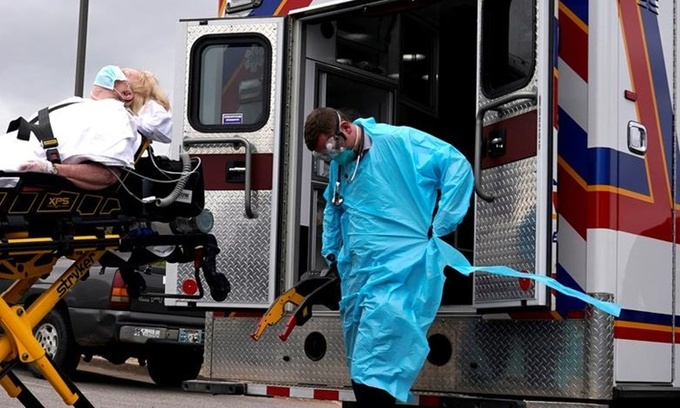 Nhân viên y tế di chuyển một bệnh nhân nghi nhiễm Covid-19 ở Oklahoma, Mỹ, hồi tháng 4 năm ngoái. Ảnh: Reuters.