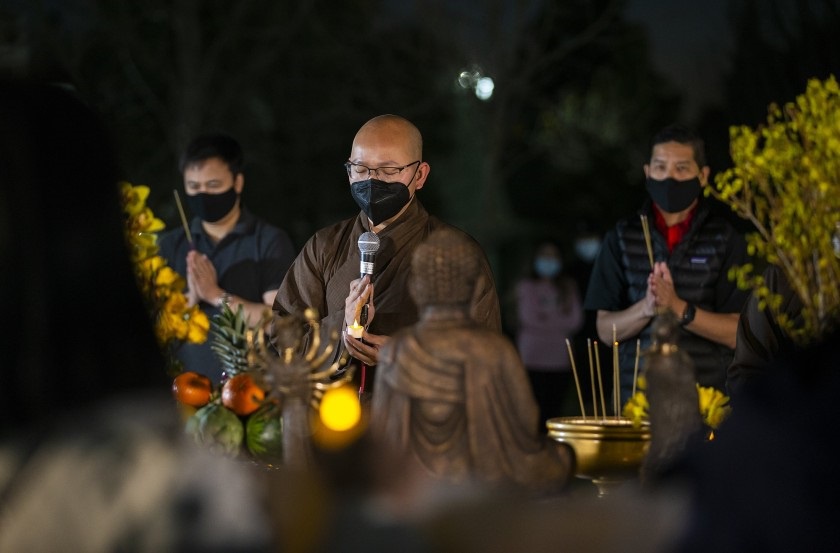 Một nhà sư tham gia cầu nguyện tại buổi thắp nến. Ảnh: LA Times.